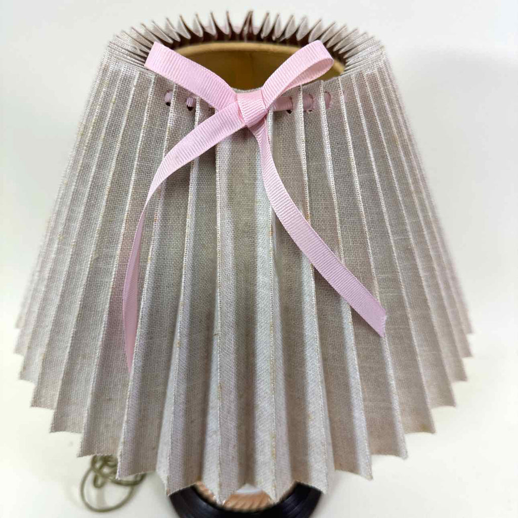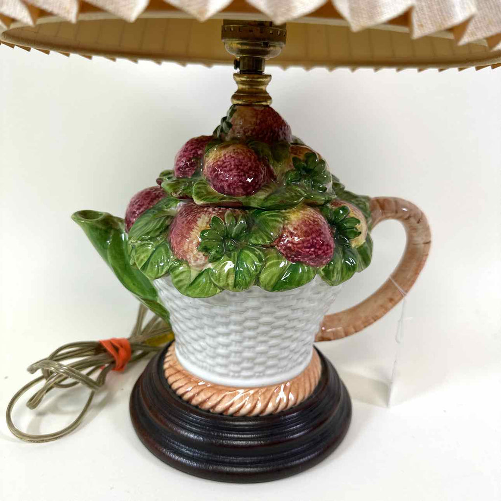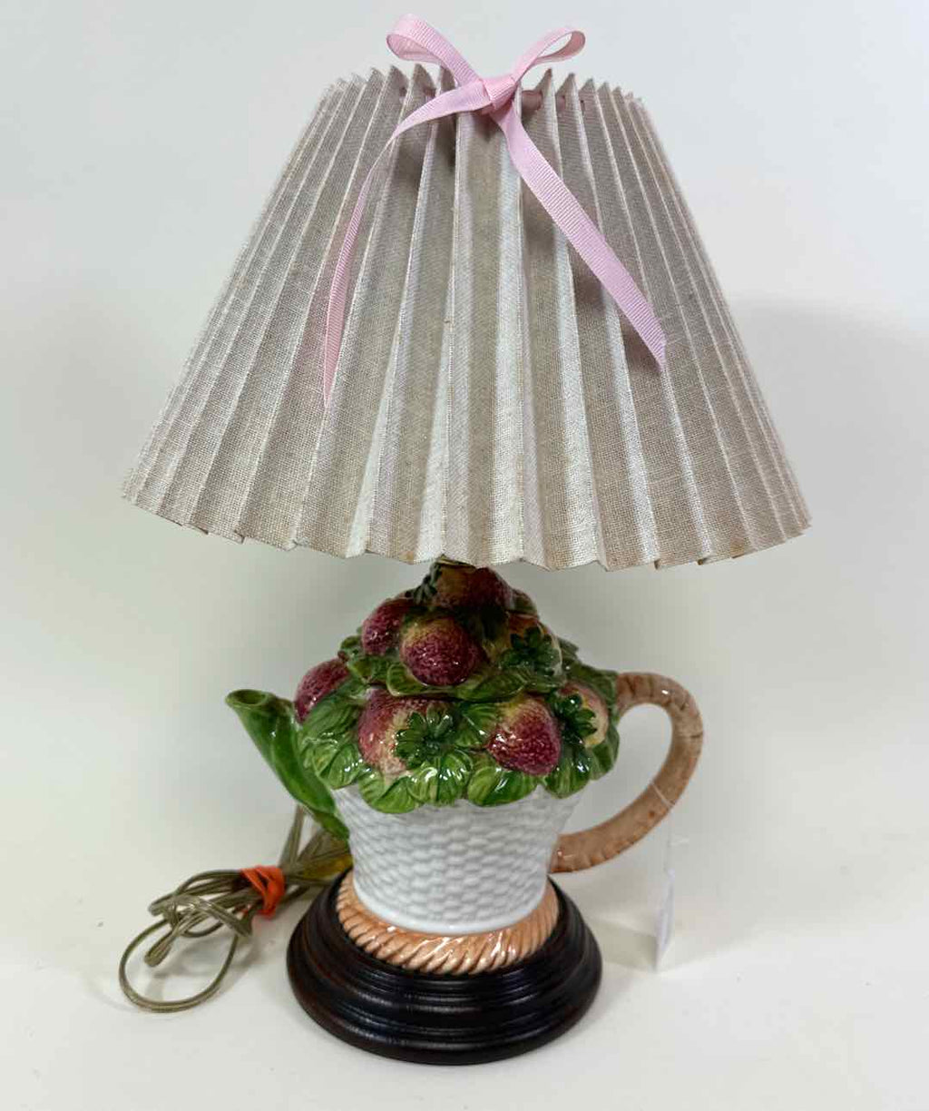 Teapot & fruit themed accent lamp w/ pleated shade & pink bow