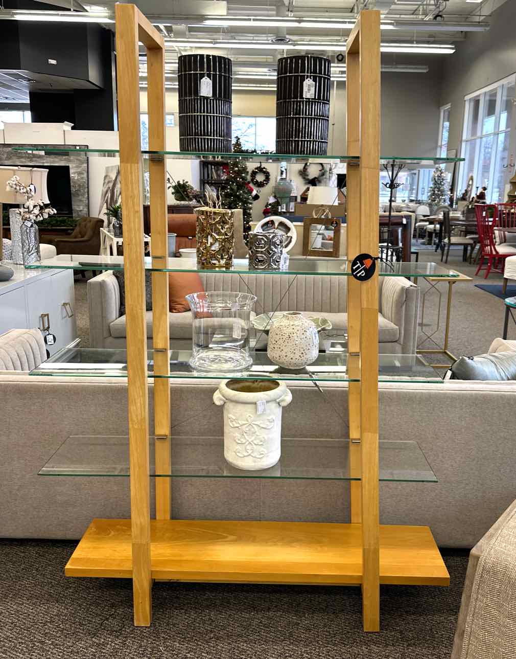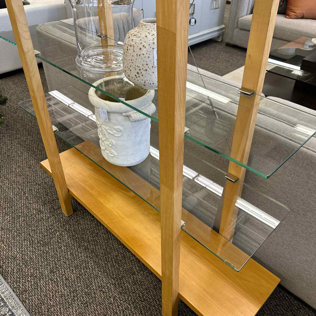 Four tier glass display shelf, natural wood, wire X back.