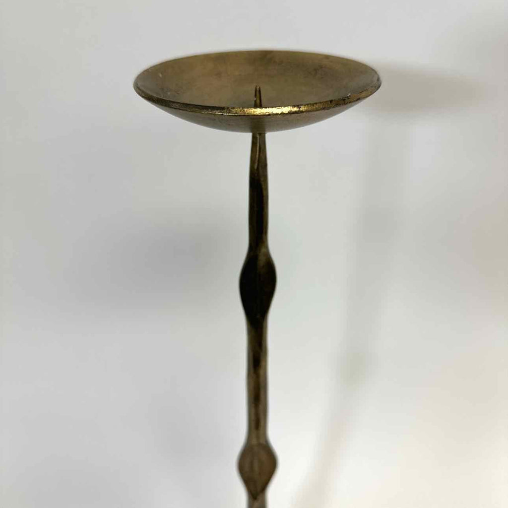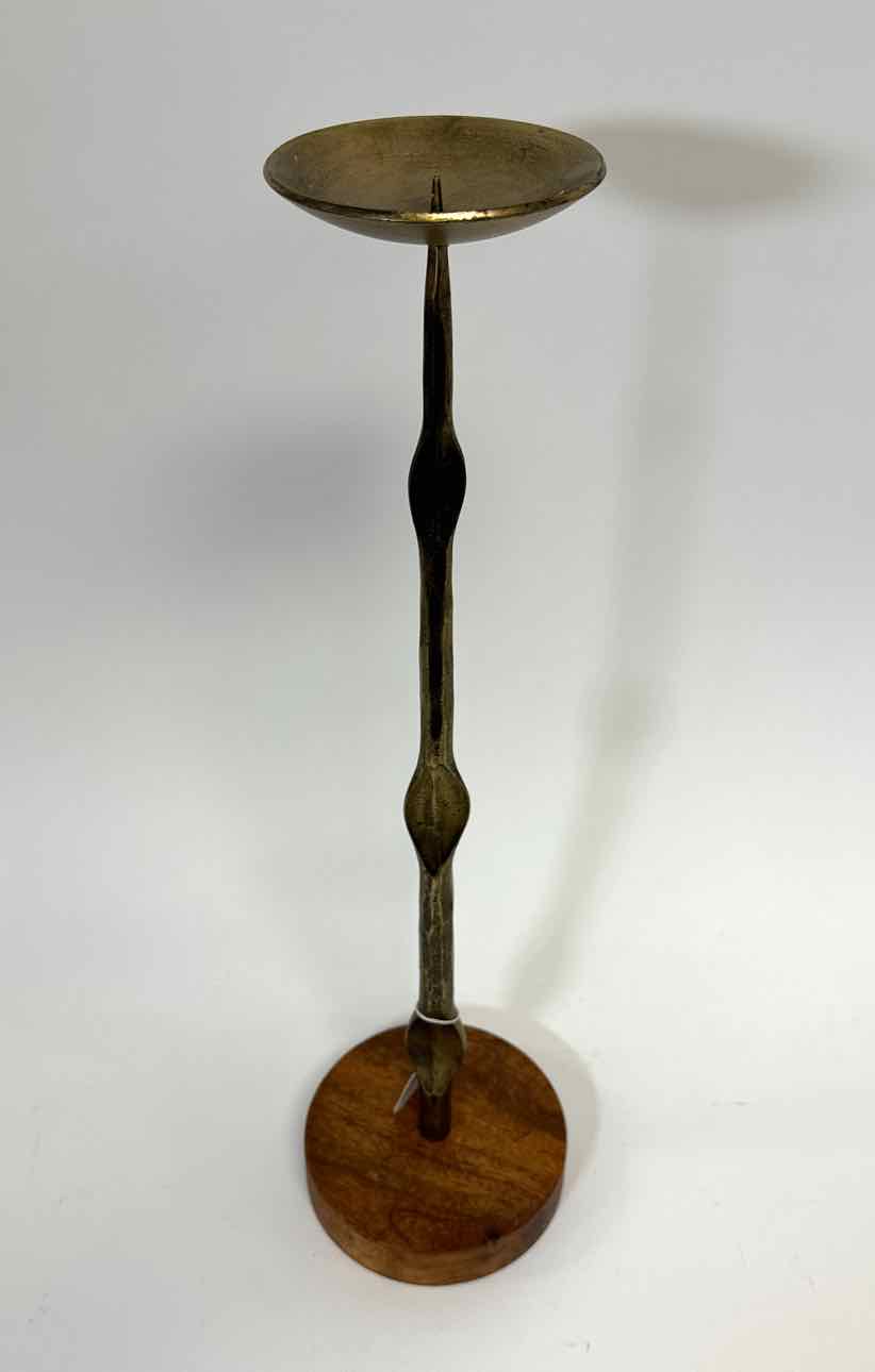 Antique gold hammered metal rod style candle holder w/ round natural wood base