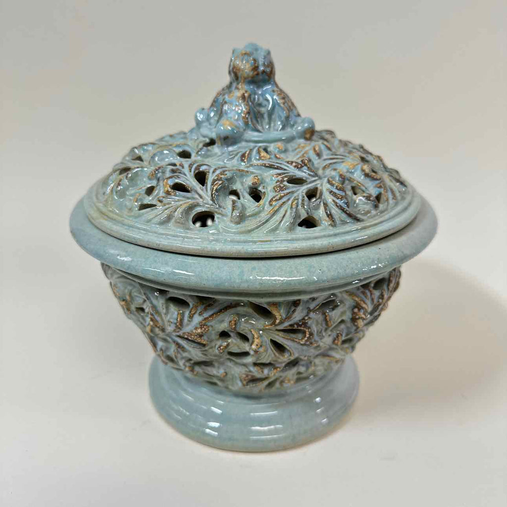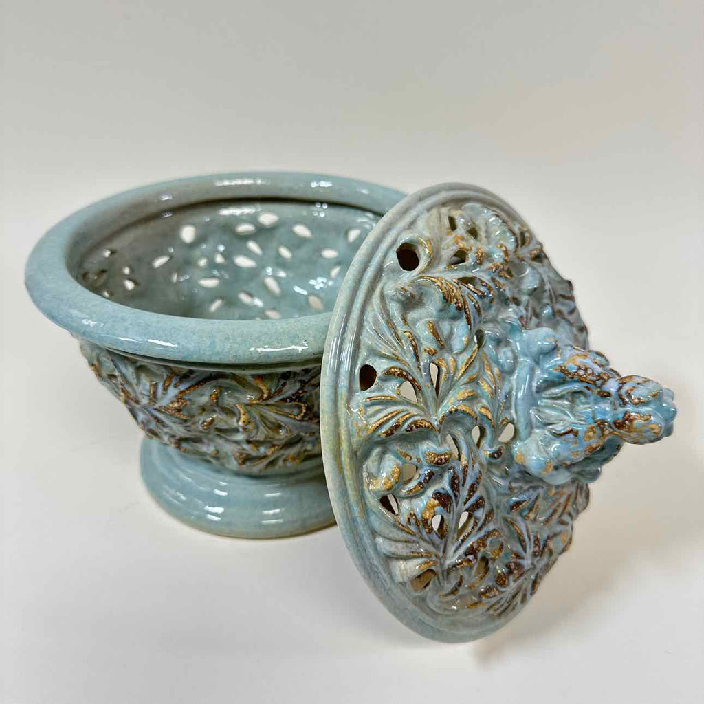 Light green footed jar w/ cut out & textural pattern. Gold accents the raised areas. Has lid