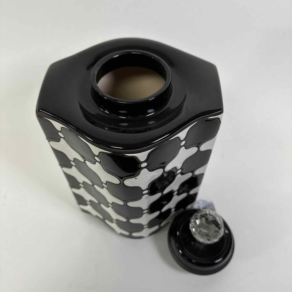 Black & white canister w/ geometric pattern & faceted crystal knob on lid