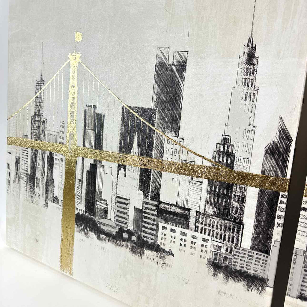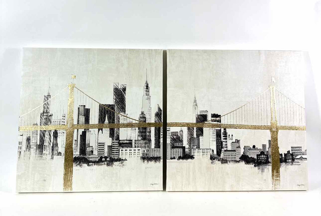 Set of (2) Black & white prints on canvas of New York City skyline w/ gold bridge.