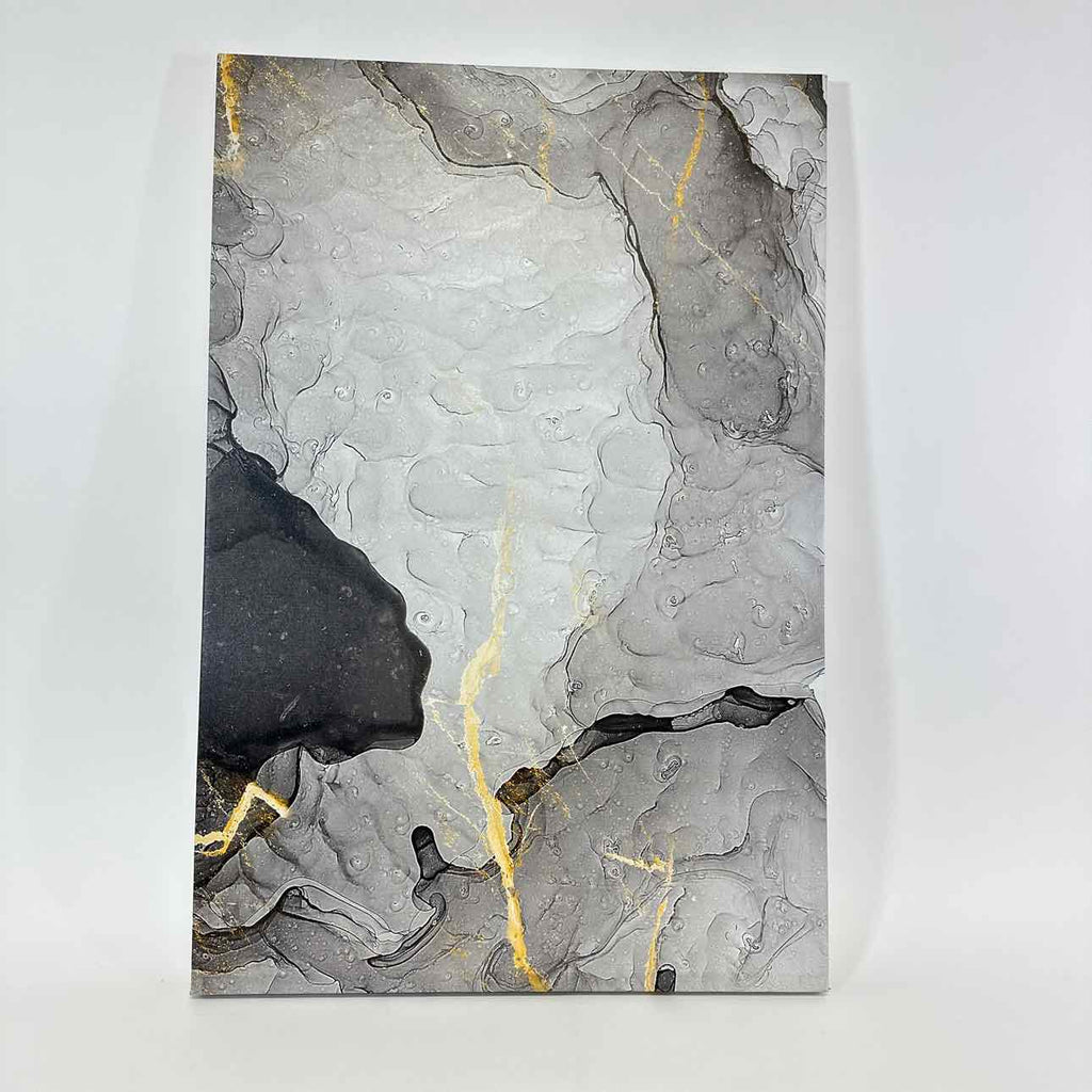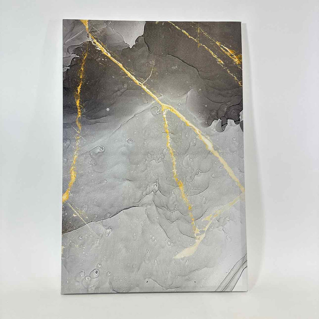Wrapped canvas; abstract white/light grey/black, yellow accent.