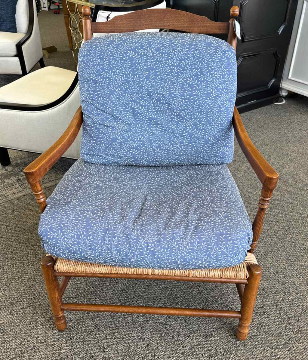Ladderback wood chair with rush seat; blue/white cushion with ties.