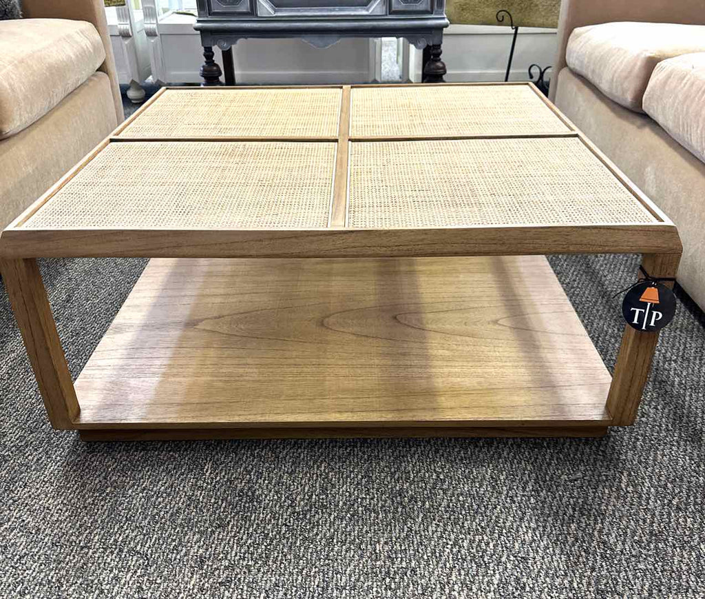 Blonde square coffee table with rattan panel top, shelf on bottom.