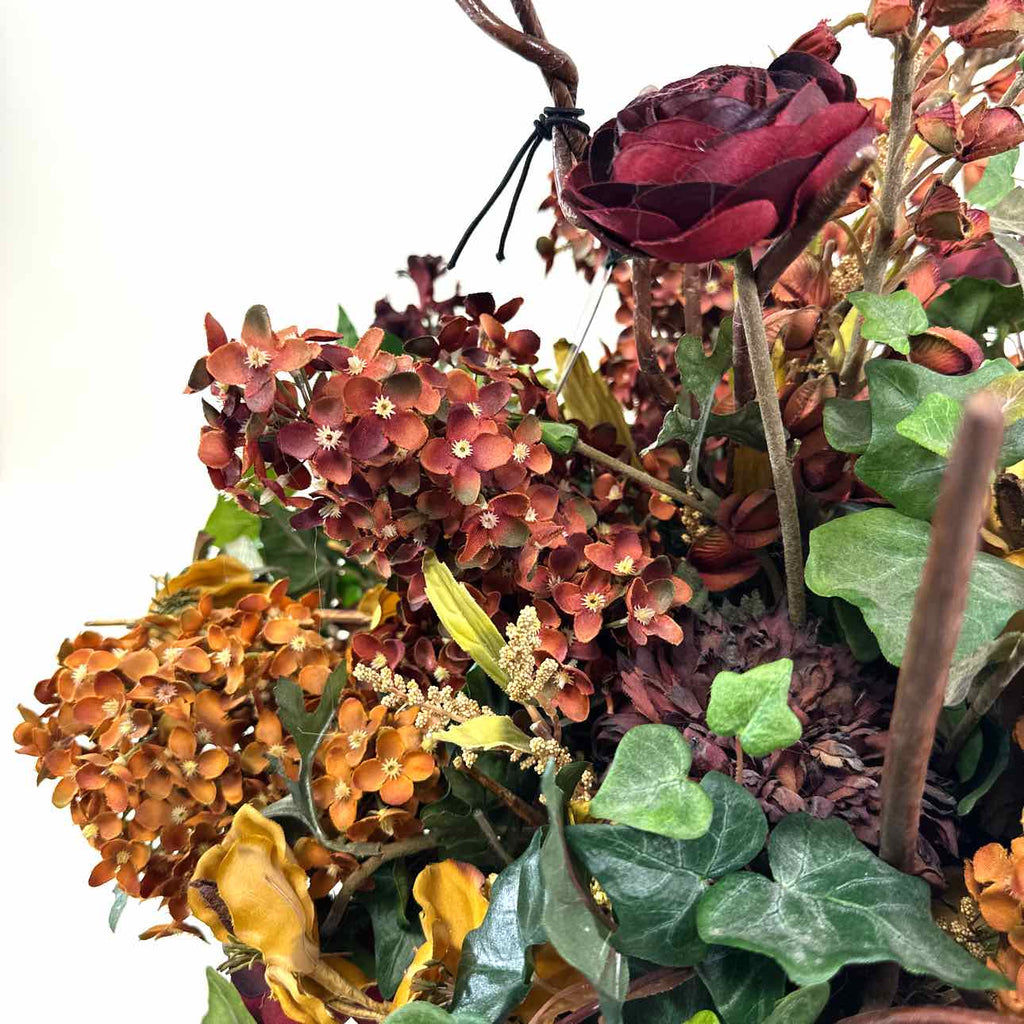 Burgundy, rust, & gold flowers w/ mixed greens in footed urn