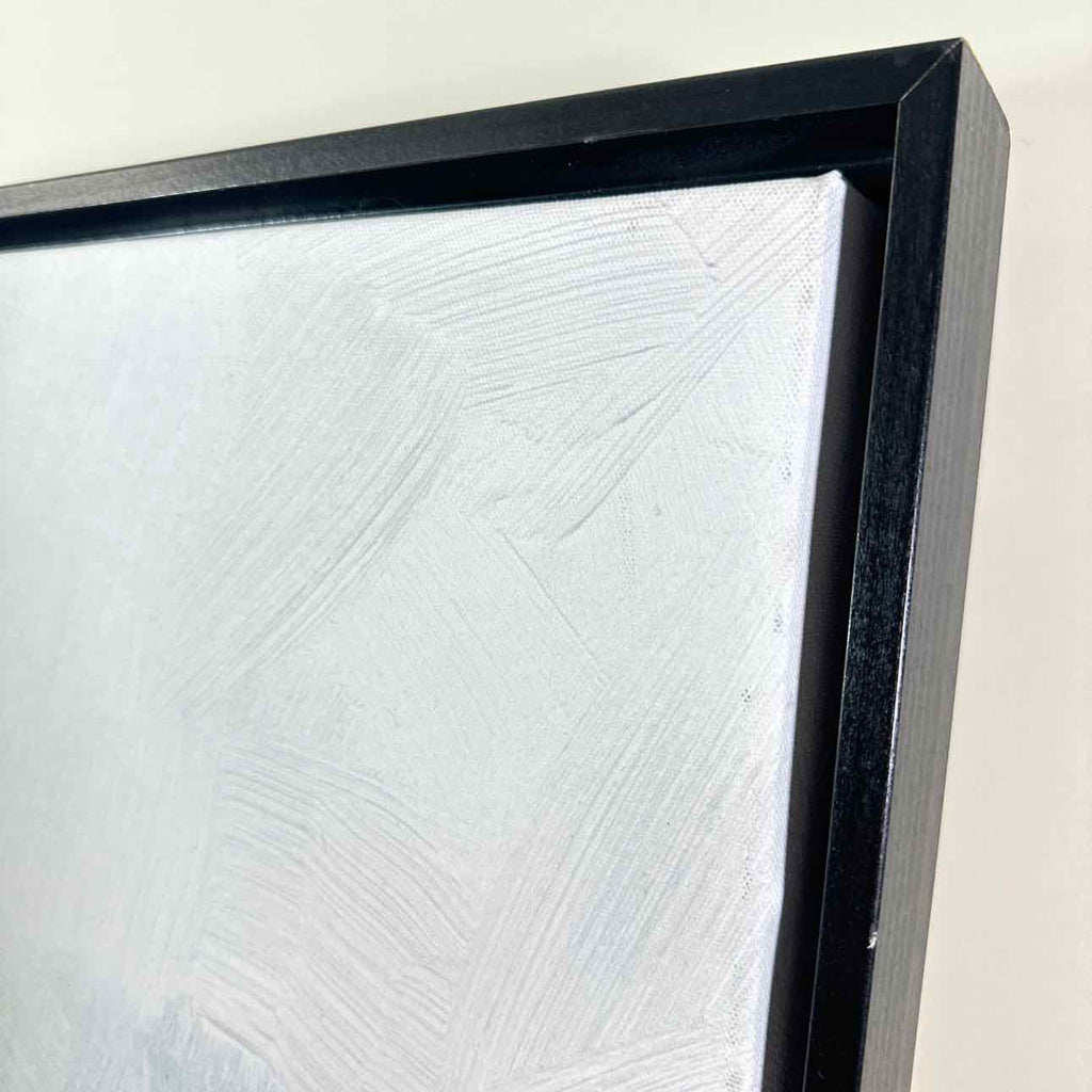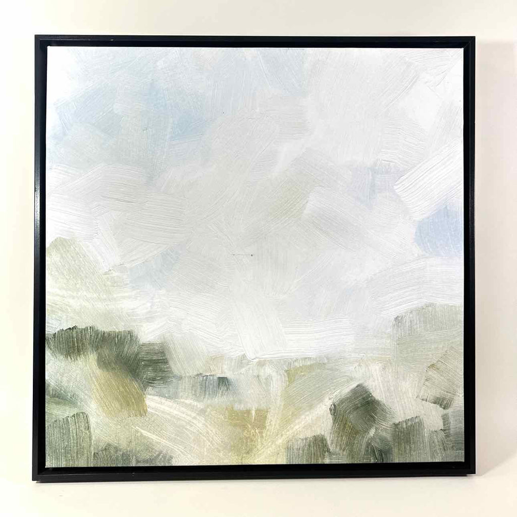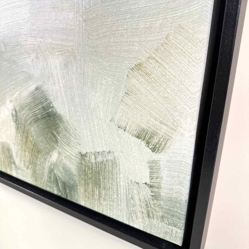 Abstract greens to blues & white brush strokes on canvas, black box frame