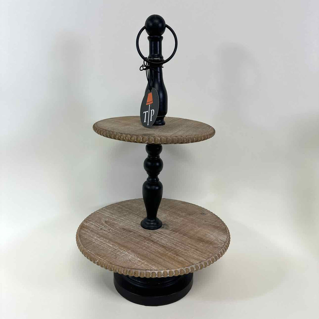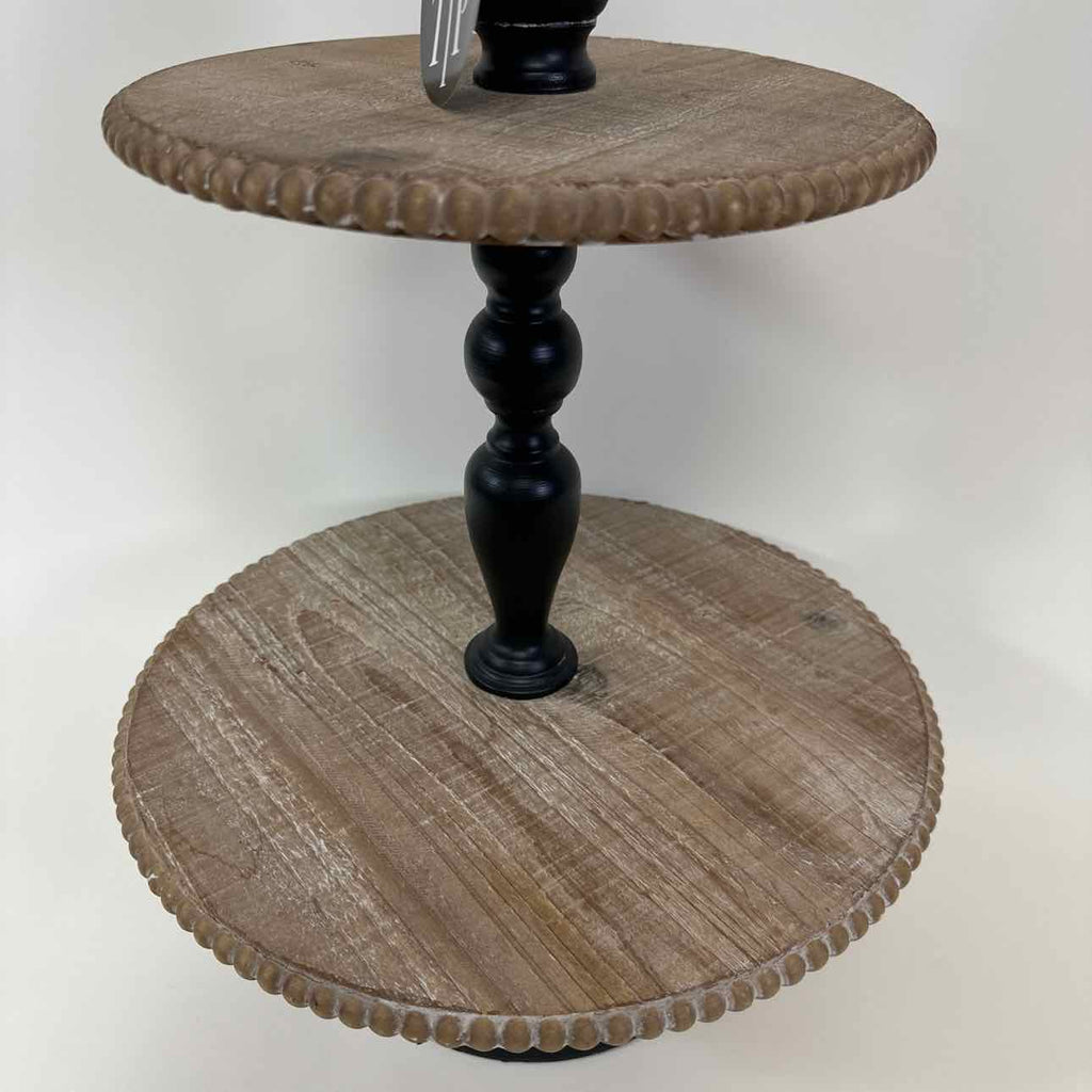 Two tier black & white round wood display stand w/ beaded edge
