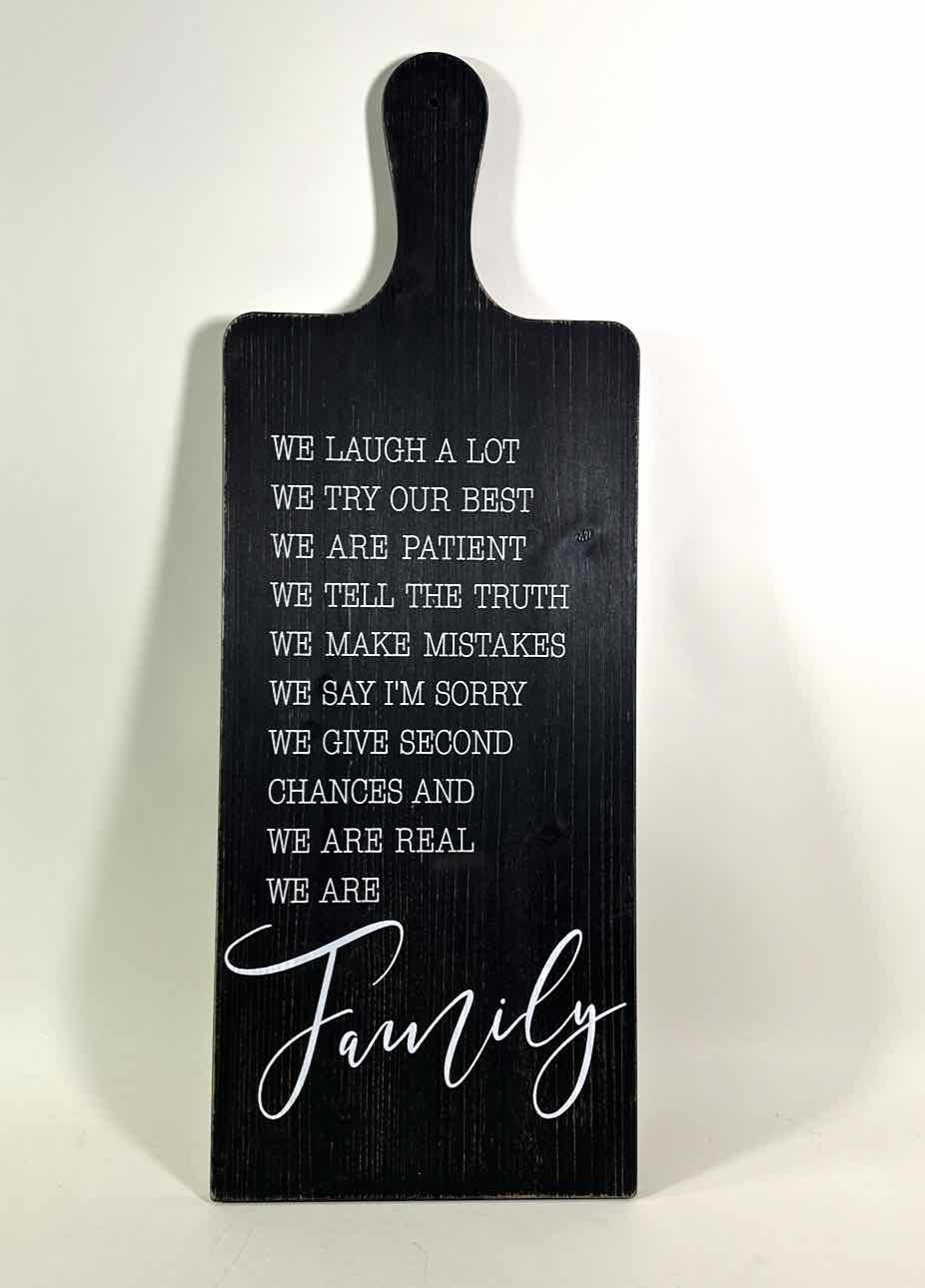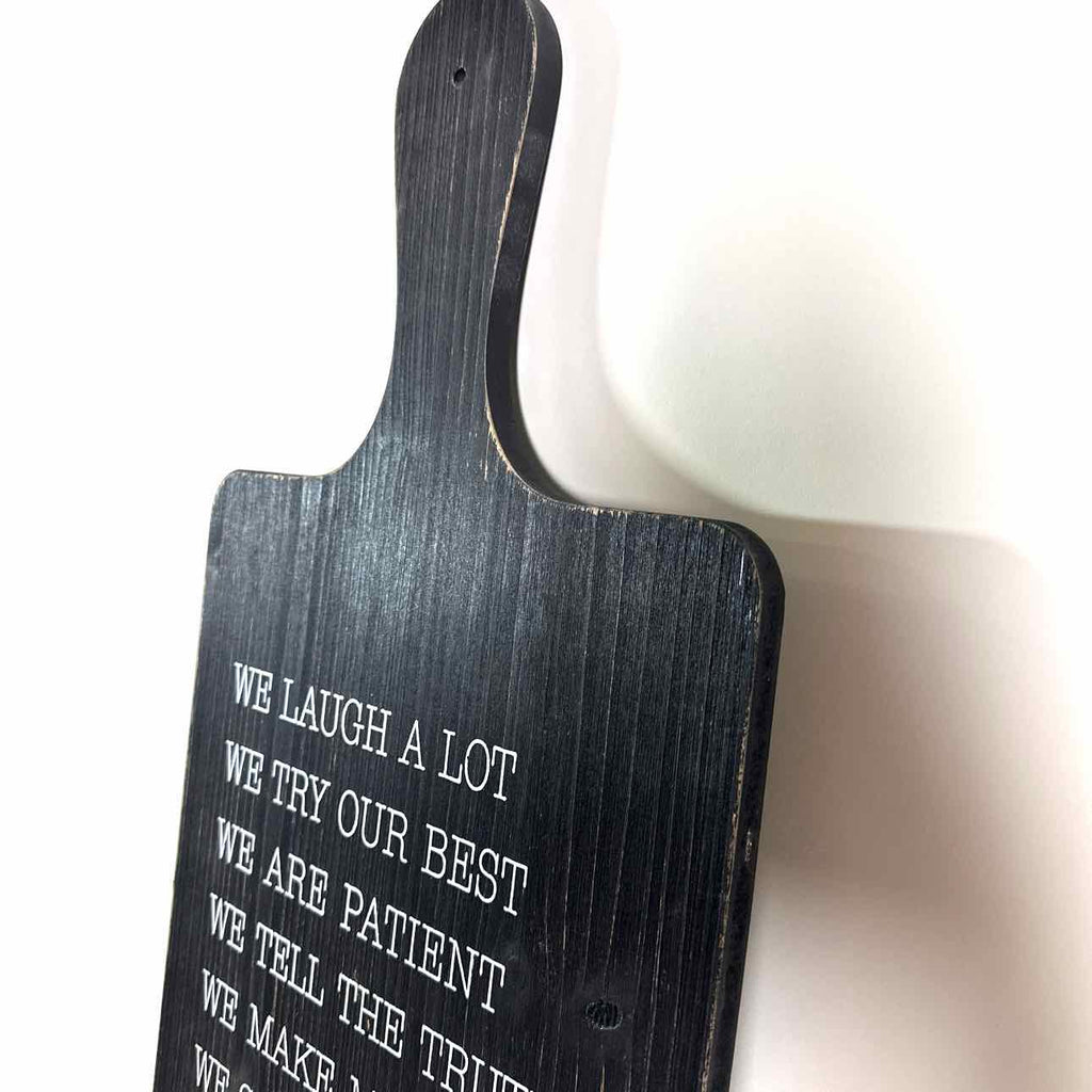 Phrase art on black wood paddle shaped board.