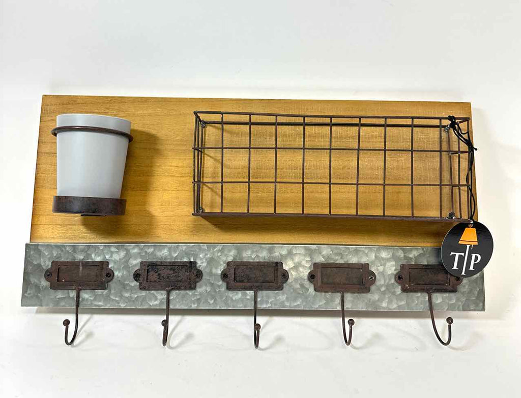 Wood wall hook unit w/basket, 5 hooks, pencil holder, wire basket, silver tin accent
