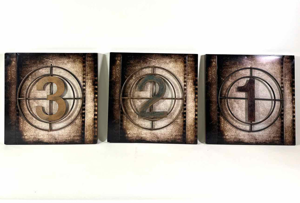 Set of (3) metal movie themed wall hangings w/ "1", "2", "3"