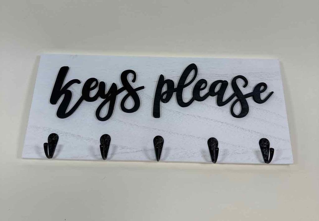 Wood sign says "KEYS PLEASE" w/ five black hooks